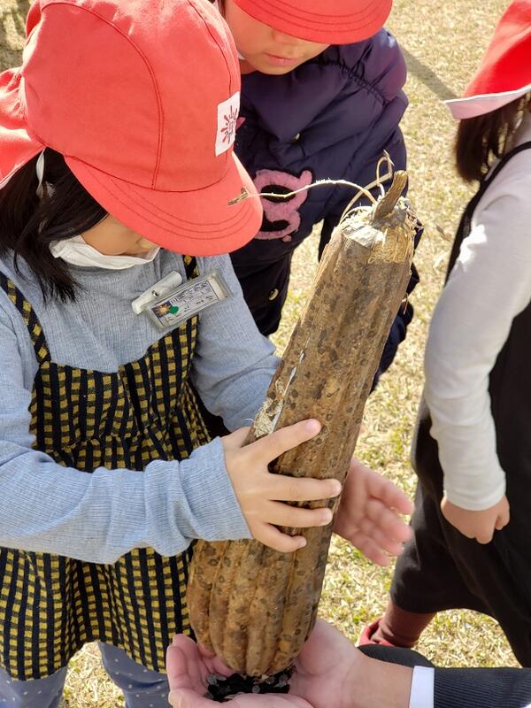 美嚢を使って実を選別する様子に興味津々な子どもたち。