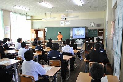 6月9日(火曜日)午後、JA西都の職員の方をお招きし、中学2年生に対して郷土の名産品「中型カラーピーマン」についての講話をしていただきました。