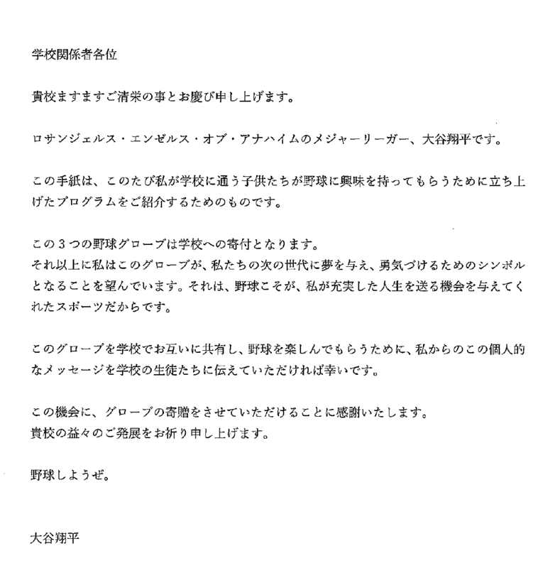 また、前回のホームページでお伝えした大谷翔平選手から届いたグローブも紹介されました。大事に使っていきたいですね。