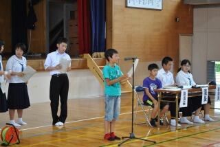 8月30日(火)の朝の活動で、児童生徒集会を実施しました。。中学生と小学校5年生6年生が集まり、各専門部の今学期の目標を聞きました。生徒会を中心に自分たちで課題を解決していこうという取組は、とても大切なことです。目標を達成するために頑張っていきましょう。