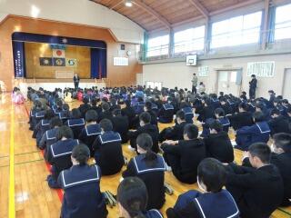 1月12日(火)朝、児童生徒集会がありました。小学校5年生から中学校3年生の児童生徒が集まり、3学期の各委員会の目標について確認しあいました。児童生徒の皆さんの自治活動として、自分たちで決めたことをお互いに助け合いながら、全員が目標を達成してほしいと思います。