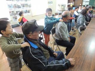 その御礼に1年生が、おじいちゃんやおばあちゃんの肩もみをしました。おじいちゃんもおばあちゃんもにこにこ顔でした。心と心の交流、ふれあいを通して、やさしい心、思いやりの心がはぐくめました。