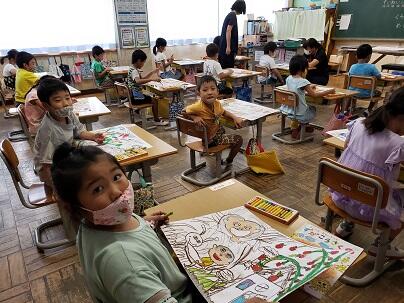 1年生です。色づかいを工夫して、表情豊かな絵をかいていました。