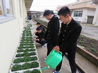 中学部全員が一人3鉢を担当し、卒業式当日に式場を飾る花を育てています。昼休みになると、水やりや花芽摘みをする姿が見られます。きっと式当日は、美しい花が卒業生の門出をお祝いしてくれることでしょう。