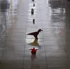 生徒会に代わって、ろうかの折り鶴のお世話を