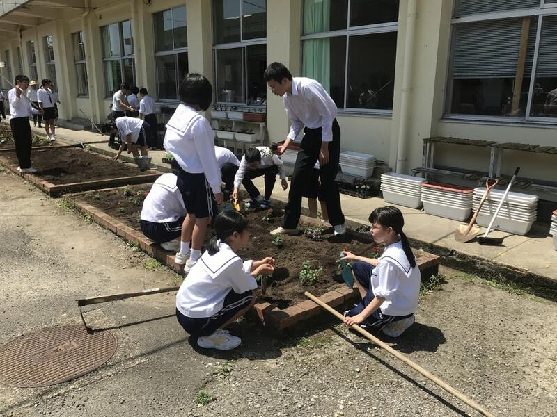 中学生がボランティア活動で花壇を耕し、花の苗を植えました。日差しに負けず、さわやかな汗を流しながら一生懸命作業をしました。きっときれいな花が咲くことでしょう。楽しみです。これからも世話をお願いします。