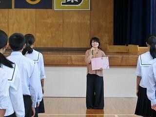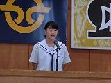 二人目は、新しい養護助教諭の下湯瑞乃先生です。「大学を卒業したばかりで、学校での勤務は初めてですが、精一杯頑張ります。」とあいさつがありました。下湯先生の座右の銘は「一期一会」だそうです。出会いを大切にされているということです。とてもいいことですね。また、中学校時代の話もされて、生徒たちは真剣に話を聞いていました。