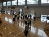 まず最初に、体育館でひもろぎの付け方を先生に教えてもらいながら、1年生は先生や先輩に付けてもらいました。