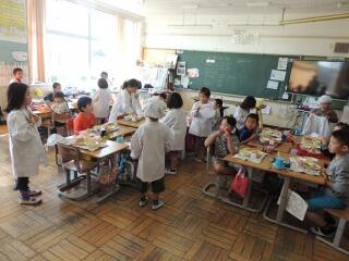 1年生が今週から給食当番をするようになりました。6年生のお兄さんやお姉さんに教えてもらいながら、はじめての給食当番。みんな上手にできていました