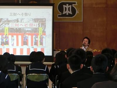 郷土の名産品「中型カラーピーマン」の講話がありました。(中学2年生)