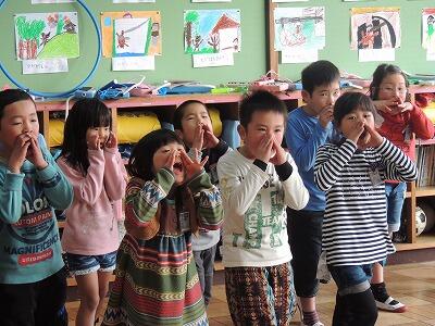 今日は石野田地区の方が2名来てくださり、子どもたちに、まず足の運び方を教えてくださいました。石野田臼太鼓踊りは、飛び跳ねる激しい動きがあるのが特徴で、真冬でも汗びっしょりになる踊りです。子どもたちは、難しい足の動きを覚えようと一生懸命に頑張っていました。