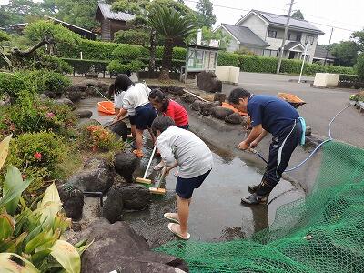 5月28日にプール清掃と並行して玄関前の池の清掃をしました。