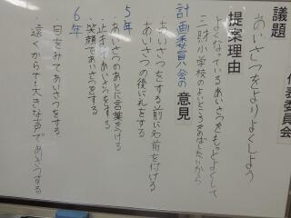 10月3日(月)に小学部6年生と5年生の代表者が集まり、代表委員会を開きました。これは、子どもたち自身が主体的に学校生活をよりよくするために、議題を提案し、共通理解のもと、みんなで取り組んでいこうとする話し合いの場です。今回は、「あいさつをよりよくしよう」という議題のもと、どうすればもっとよくなるかを話し合いました。「遠くからでも大きな声で」「名前を言ってあいさつする」など建設的な意見が出ました。決まったことを全員に広め、みんなで実践すれば、もっとすばらしいあいさつができるようになるでしょう。あいさつ日本一を目指してがんばりましょう。