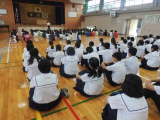 8月30日(火)の朝の活動で、児童生徒集会を実施しました。。中学生と小学校5年生6年生が集まり、各専門部の今学期の目標を聞きました。生徒会を中心に自分たちで課題を解決していこうという取組は、とても大切なことです。目標を達成するために頑張っていきましょう。