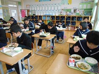 普段はグループで食べる給食ですが、3学期は感染症予防のため前を向いて食べています。これからも残さずに食べてもらいたいです!!