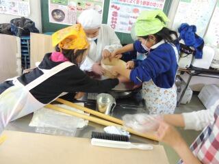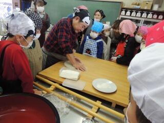 2月23日【火】参観日の日に4年生が、自分たちで育てたそばでそば打ち体験活動を行いました。地域の方からそばのこね方や切り方などを学び、お母さん方と一緒につくりました。