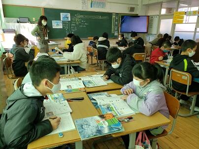 4年生は版画の下絵描きの時間でした。作業前に廊下に掲示している5年生の作品を参考にしてました。完成のイメージがわいたかな?仕上がりが楽しみです。