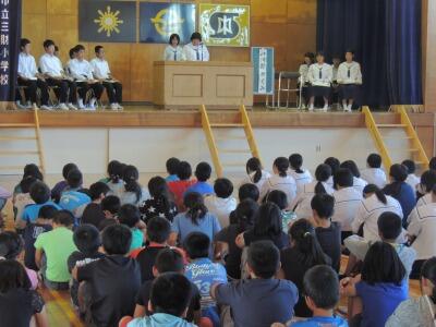 10月29日(木)5~6校時に小学校体育館で新しい生徒会役員を決める選挙が行われまた。小学校5年生から中学校3年生までが参加し、候補者の皆さんの演説を聴き、その後投票をしました。普通の選挙と同じ方式で行われました。子どもたちは真剣な顔で投票に臨んでいました。