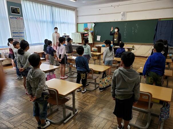 登校後、1年生は朝の会で先生とあいさつの練習をしていました。