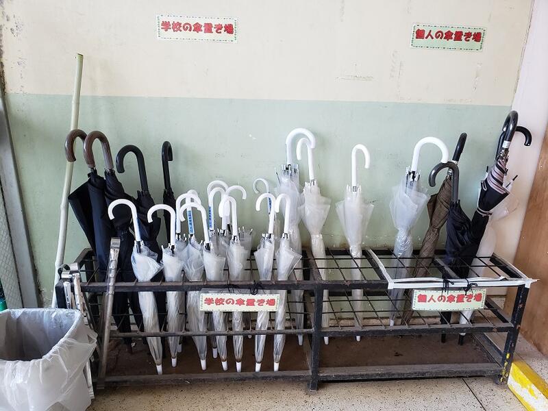 左が学校の傘置き場で右が個人の傘置き場。