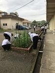サッカー部の奉仕作業のようすです。花壇の草取り、手洗い場の掃除