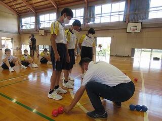講話のあと、体育館に2コート作り、トーナメント形式でボッチャの競技に取り組みました。