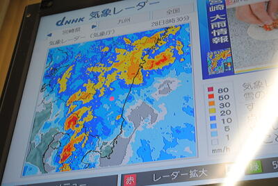 本校では、部活動の時間も含めて、児童生徒が学校にいる間は、職員室のテレビに、NHKの気象レーダーを写して、雨の様子や、雷の予報等を見ながら活動の態度決定を行っています。