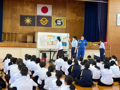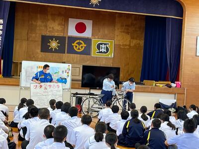 今日は小学部、中学部共に、西都警察署、西都地区交通安全協会から講師を招き交通安全教室が行われました。