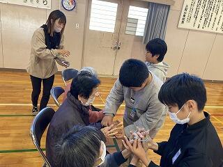 子どもたちは、事前に「どんな遊びだったら喜んでいただけるか」を考えての交流会でした。少人数の中での会でしたが、じっくりお一人お一人に声をかけて、昔遊びを教えてもらう中で会話をはずませていました。たくさんの笑顔が見え、子ども達も一安心していたようでした。