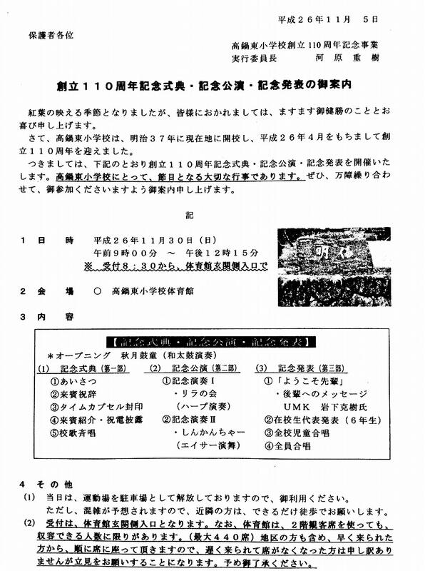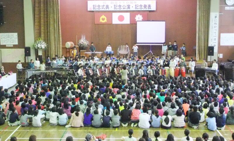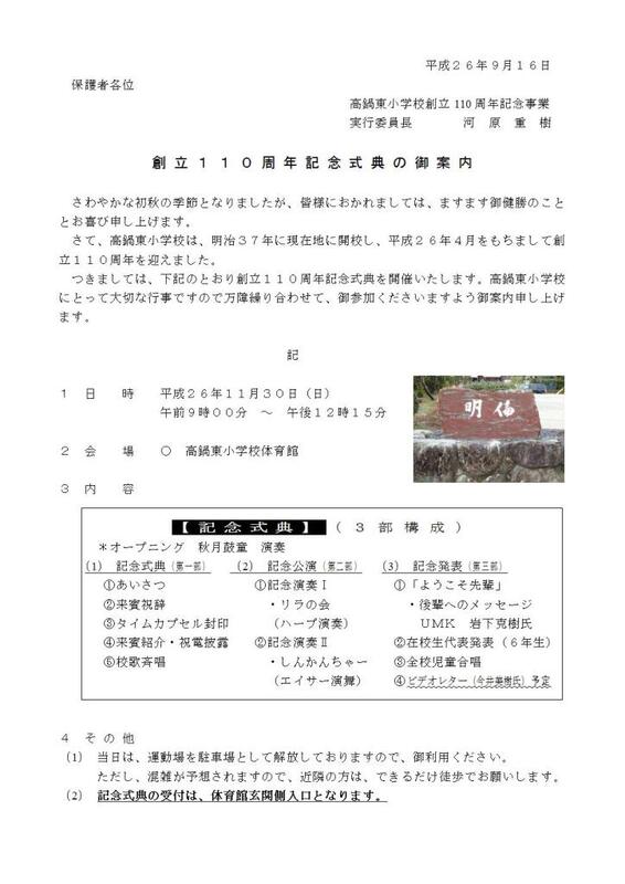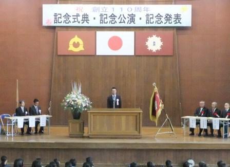 そして、河原重樹実行委員長(写真左)があいさつをしました。学校の先生や保護者だけでなく、子ども達の教育に携わってくださる地域の人たちといっしょに110周年を祝いたいというお話でした。