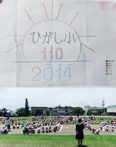 日和となりました。写真上の文字になるように全校児童が運動場に並びま