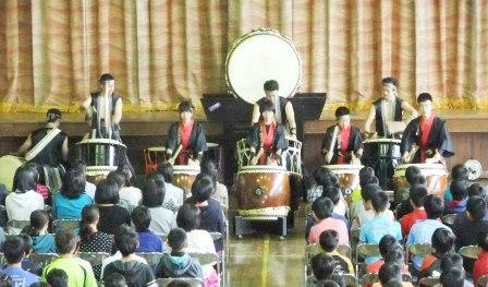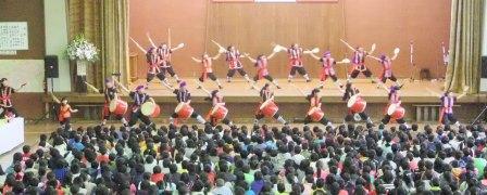 秋の運動会で毎年5年生へご指導いただいている「高鍋しんかんちゃー」の28名の方々がお祝いにかけつけてくださり、3曲ご披露されました。最初のうちは体が微妙に揺れる程度の子どもたちでしたが、徐々に動きが激しくなり、最後のBEGIN作曲の「笑顔のまんま」はリズムに合わせて歌も歌って、のりのりになっていました。