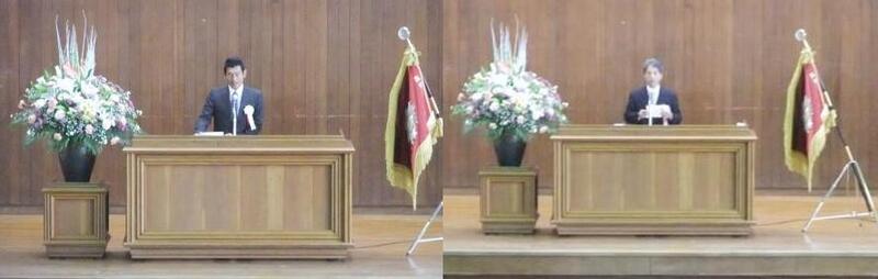 続いて、高鍋町長である小澤浩一町長(写真左)は、激動の時代を力強く生きながらも学校への尽力を惜しまなかった保護者や地域の方へ感謝するとともに、これからの時代を担う子ども達を教育していく大切さを願う祝辞を述べられました。