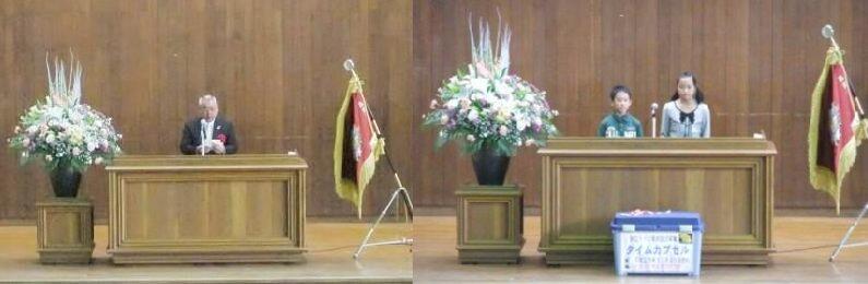 それから、6年生2名が代表となってタイムカプセルを封印しました。その中には、10年後の自分・家族・友へ宛てた手紙が入っています。子ども達はもちろん、保護者や地域の方の手紙もカプセルに入れられました。封印をしたタイムカプセルは10年間、ひっそりと時が経つのを待ちます。そして10年後、120周年の際、自宅へ郵送される手はずになっています。はたして、どんなことを書いているのでしょうか。