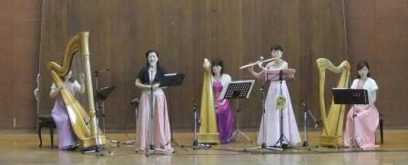 まず、 「リラの会」の皆様が、ハープ、フルートの演奏に合わせて歌を歌ってくださいました。