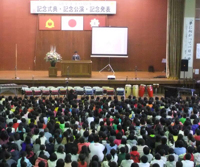 現在600名の子ども達が在籍の高鍋東小学校。全員で「赤い屋根の家」を合唱しました。いよいよ記念事業が終わりに近づき、名残惜しさを感じながら歌っているように見えました。