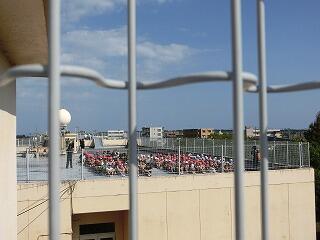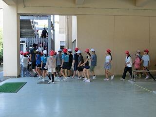 各学級のある1棟~4棟の屋上へ全校児童、職員、そして避難訓練の様子を見に来られた東区学校運営協議会委員の皆さんも一緒に避難しました。