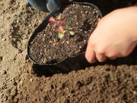 まず、果肉の付いた実の中からゴマ粒くらいの種を取り出す作業から始めました。種の周りの固い部分をすりつぶしたり、石で砕いたりして、小さな種をとりだすのは、とても根気のいる作業でしたが、さすが高学年の子ども達です。集中して作業を進めました。次に、花壇に植えこんだポットの中に、3粒ほどの種をまいていきました。これも細かな作業でした。