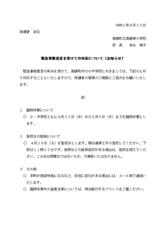緊急事態宣言を受け、町内小中学校の4月20日(月)以降の対応につきましては、4月20日(月)と4月21日(火)は時間割どおりの4時間授業(給食あり)です。4月22日(水)以降の対応につきましては、4月20日(月)に町教育委員会にて決定されますので、分かり次第安心安全メールで連絡いたします。また、詳細につきましては、4月21日(火)に配付する文書でご確認ください。ご理解とご協力をお願いいたします。