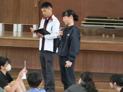 校長先生からのお話しと、保健室の土持先生から熱中症についてのお話し、体力テストの体力賞(A判定)児童の紹介、陸上スポーツ少年団の入賞者の紹介等がありました。