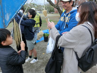 当日は大変風が強い1日でしたが、大人と子ども合わせて約80名の参加者は、一生懸命にミニ門松やしめ縄作りに取り組んでいました。