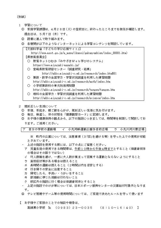 緊急事態宣言を受け、町内小中学校の4月20日(月)以降の対応につきましては、4月20日(月)と4月21日(火)は時間割どおりの4時間授業(給食あり)です。4月22日(水)以降の対応につきましては、4月20日(月)に町教育委員会にて決定されますので、分かり次第安心安全メールで連絡いたします。また、詳細につきましては、4月21日(火)に配付する文書でご確認ください。ご理解とご協力をお願いいたします。