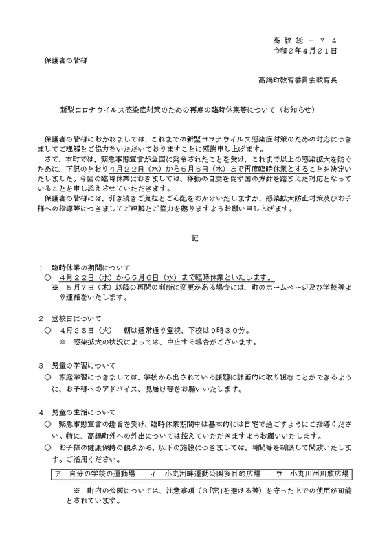 新型コロナウイルス感染症対策のための再度の臨時休業等について(表)