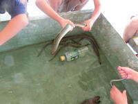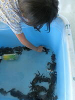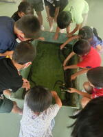 1年生「いきものふれあいきょうしつ」がありました。4棟ロビーに小丸川漁業協同組合の方々によって「うなぎ」「かに」をご準備いただきました。子どもたちは興味津々で、時折歓声をあげて触っていました。お互いに顔を見合わせたり、誇らしげに触った自分を学級担任にアピールしたりしていました。