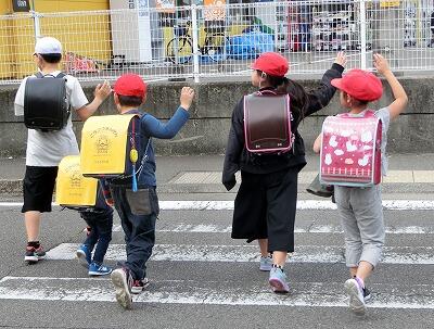 とかけ声をかけた後、片手を挙げて、横断歩道の真ん中までは右から来る車に注意しながら歩き、真ん中からは左から来る車に注意しながら歩くことになっています。