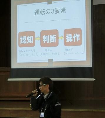 まず初めに、「宮崎県の交通事故の様子」や、「歩行者や自転車に乗っている人の認知状況(同じように見えると思っていても、人によって認知の度合いが違う!)」等のご説明がありました。これにより、車が遠くにいると思っていても、実際にはかなり近づいているという状況も起こりうるのだということが分かりました。