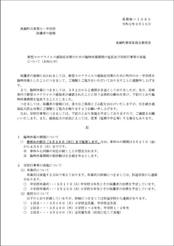 臨時休業期間の延長等について(高鍋町教育委員会)