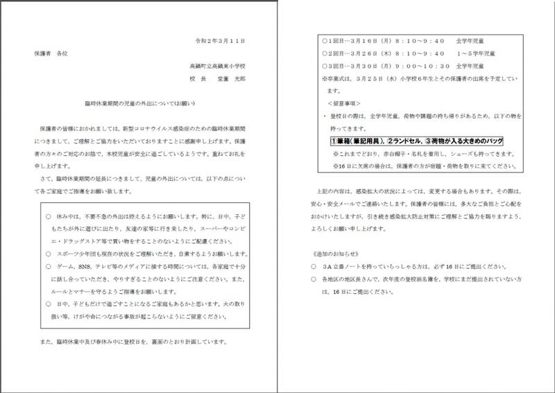 臨時休校中の対応について(高鍋東小学校)