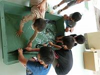 小丸川漁業協同組合のみなさんは、「これから稚魚を小丸川に放流しに行きます。うなぎは海に出て数年たつと大きくなって、また小丸川にかえってきます」と教えてくださいました。みんなに触られて多少ぐったりしていたうなぎさん達は、今頃川で元気に泳いでいることでしょう。