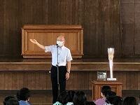 4月に行われた聖火リレーを走られた、町在住の下川洋一さんが、実際に使用したトーチを子ども達に見てもらいたいと来校されました。